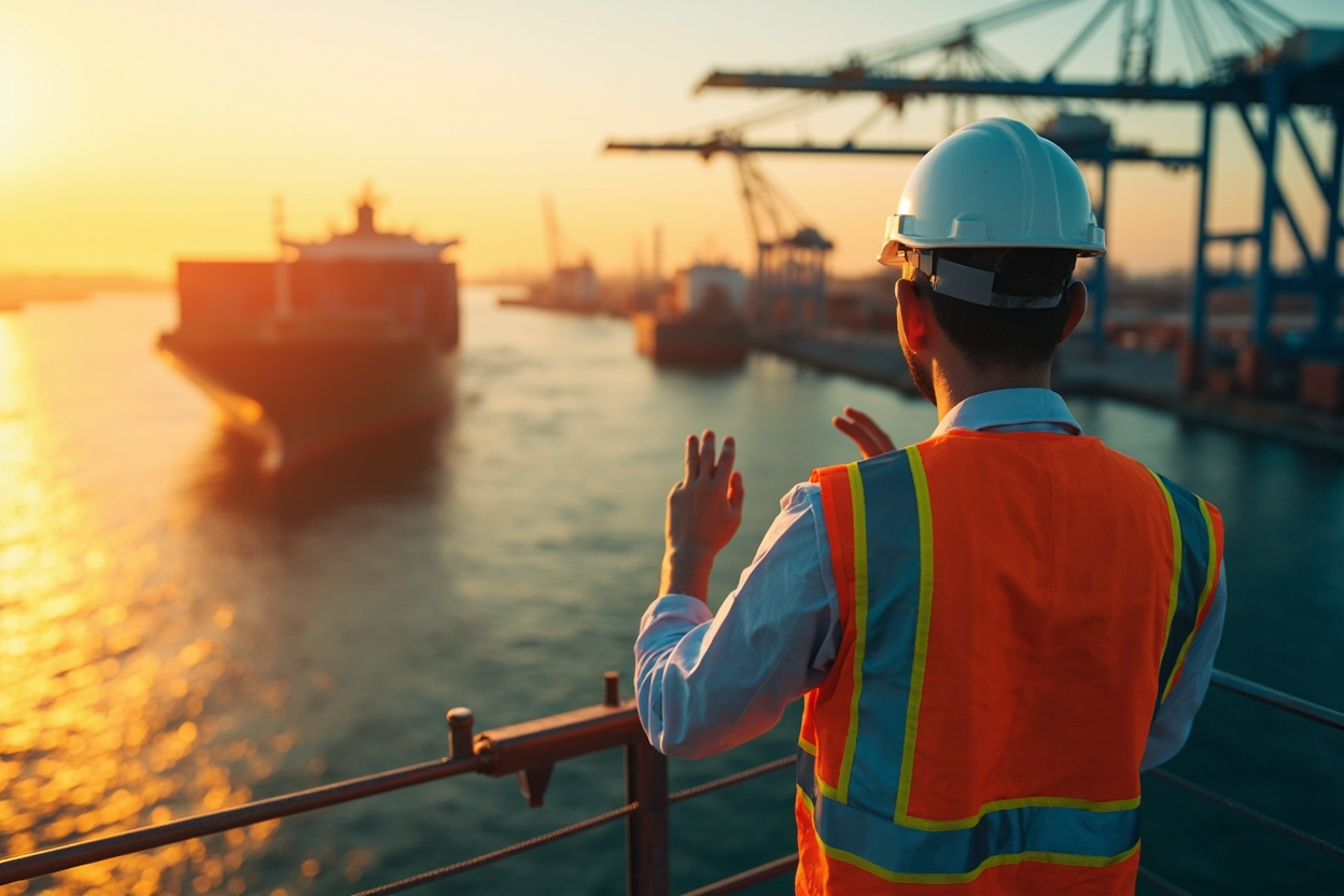 A traffic control tower overseeing container ships, symbolizing Kubernetes Ingress managing network traffic.