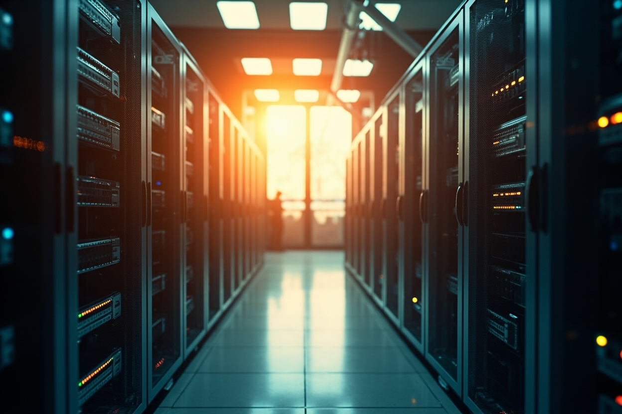 Interconnected server racks representing Kubernetes resource management, optimized for performance and cost efficiency.